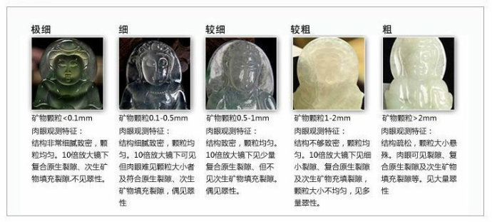 二、翡翠的基本概念1.翡翠知识1.1 种(共4级) 种指的是翡翠的质地,也是对一件翡翠产品的最基本的描述,在市场上的所讲的老种、新种、玻璃种、冰种、蛋清种、豆种、油青种、蓝花、蓝水、晴水等等都是习惯上的商业名称,但是由于这些商业名称在标准上并没有一个明确的定义,所以并不能把它作为我们的分级标准。事实上,翡翠的结晶体颗粒大小和这些颗粒的交结关系是决定翡翠商业品种的主要原因,并由此制定出以下分级标准: