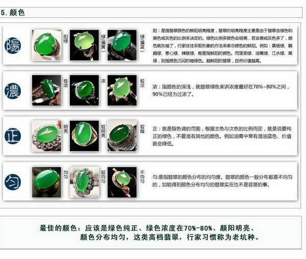 1.4 色(共6级) 翡翠常见的颜色有绿色、白色、红色、紫色、黄色等,其中以带绿色为最优的品种,如果一件翡翠中既有绿色,又有红色和紫罗兰色,那也是一件非常难得的翡翠。 对于绿色的翡翠来说(例如戒面),传统上有“浓”、“正”、“阳”、“和”之说。所谓“浓”是指绿色饱满、浓重;“正”是指绿色纯正,不含杂色;“阳”是指绿色鲜艳、明亮;“和”是指绿色均匀、柔和。 在色温为5000K的连续光源照射下观看翡翠的颜色分级为: